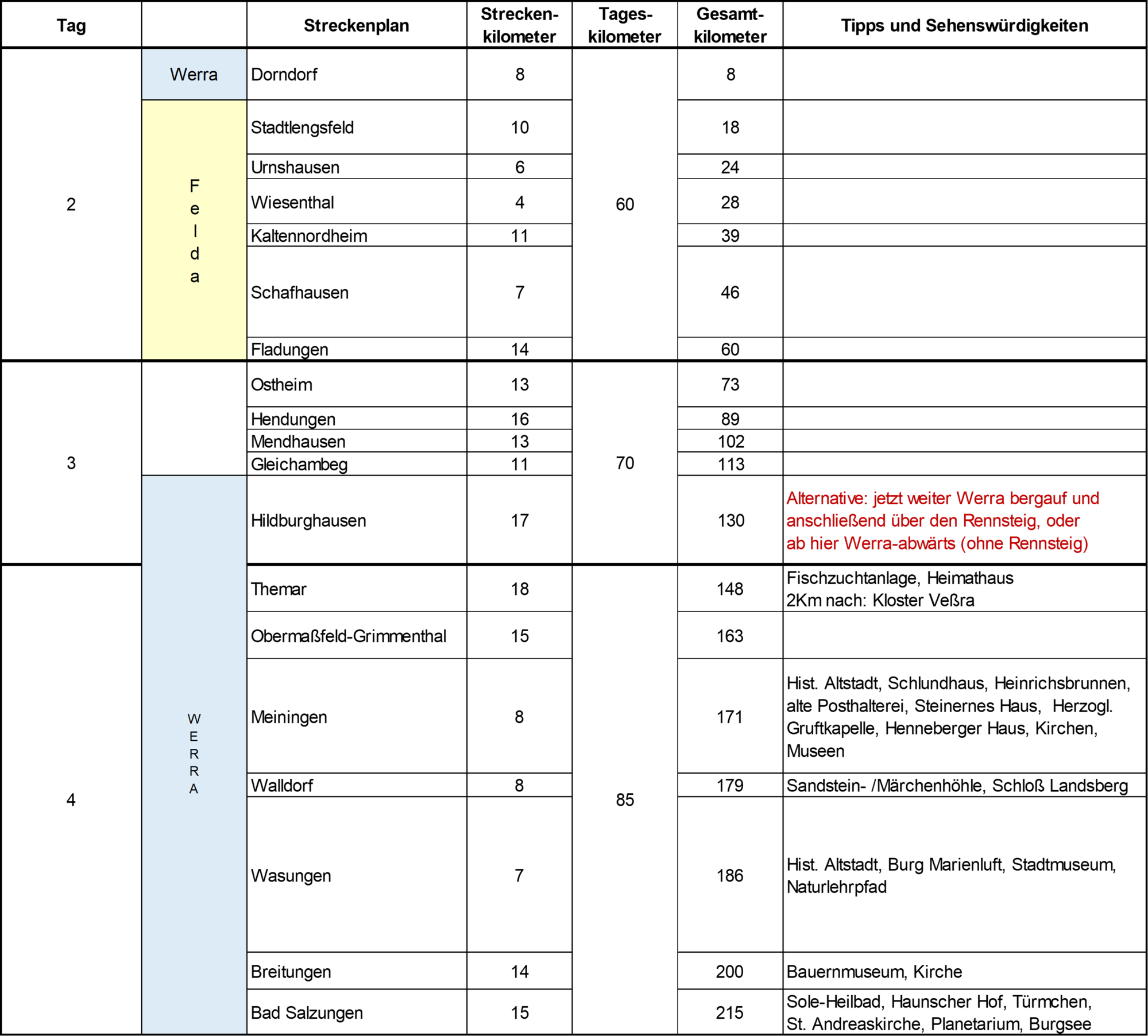 Entlang den Unterläufen von Werra und Fulda radelt man schön an Uferwegen. Der Rennsteig ist zwischen Oberhof und Eisenach wegen Grobschotterwegen nur bedingt tourenradtauglich. Für eine Rundtour sollte daher eher die Variante über das Feldatal ausgewählt werden. An der Werra zwischen Vacha und Meiningen kann man im Juli jede Menge Störche beobachten. So viele auf einem Fleck habe ich noch nie gesehen.