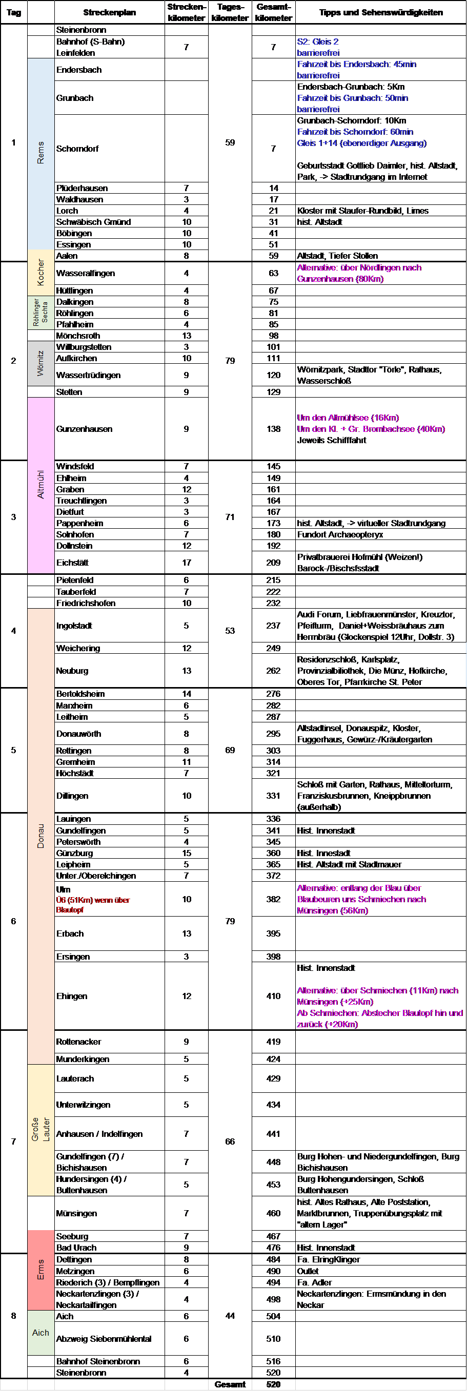 Als Startpunkt kann Steinenbronn bzw. Stuttgart gewählt werden. Mit der S-Bahn geht's bis Schorndorf. An der Rems folgen wir dem Radweg bis Aalen. Von hier geht es entweder über Wassertrüdingen oder über Nördlingen/Öttingen nach Gunzenhausen. Hier fahren wir bis kurz nach Eichstätt auf dem Altmühltalradweg, bevor wir nach Ingolstatt abbiegen. Von hier aus geht es Donau aufwärts über Neuburg und Dillingen nach Ulm. Ab Ulm nach Münsingen entweder über Ehingen und dann das Lautertal hinauf, oder ab Ulm an der Blau nach Blaubeuren und dann über Schelklingen das Schmiechtal hinauf bis Münsingen. Von hier ist es nur ein Katzenprung bis Bad Urach. Zuletzt an der Erms über Metzingen an den Neckar, dann über das Aichtal wieder zurück nach Steinenbronn bzw. Stuttgart.
