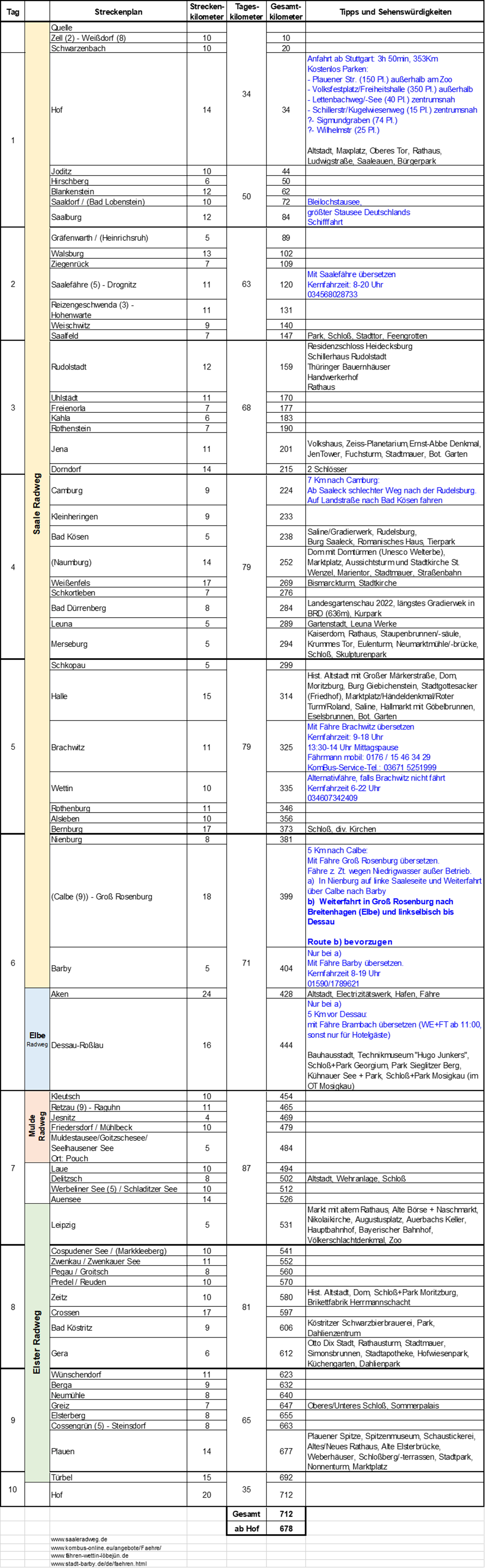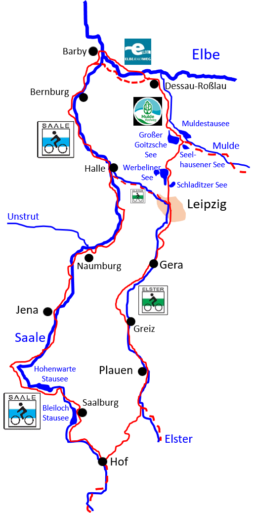 Die Quelle der Saale liegt bei Zell im Fichtelgebirge. Wir starten aber erst 34 Km später in Hof. Über Jena, Naumburg und Halle gelangen wir nach Barby, wo die Saale in die Elbe mündet. Elbaufwärts radeln wir ein Stück bis nach Dessau. Weiter geht's auf dem Mulde Radweg, den wir am Muldestausee in Richtung Leipzig verlassen. Ab Leipzig ist dann die Elster unser Wegbegleiter. Wir passieren dabei die Städte Gera, Greiz und Plauen. Ab Türbel gelangen wir dann auf einem 20 Km langen Verbindungsstück wieder zurück nach Hof.