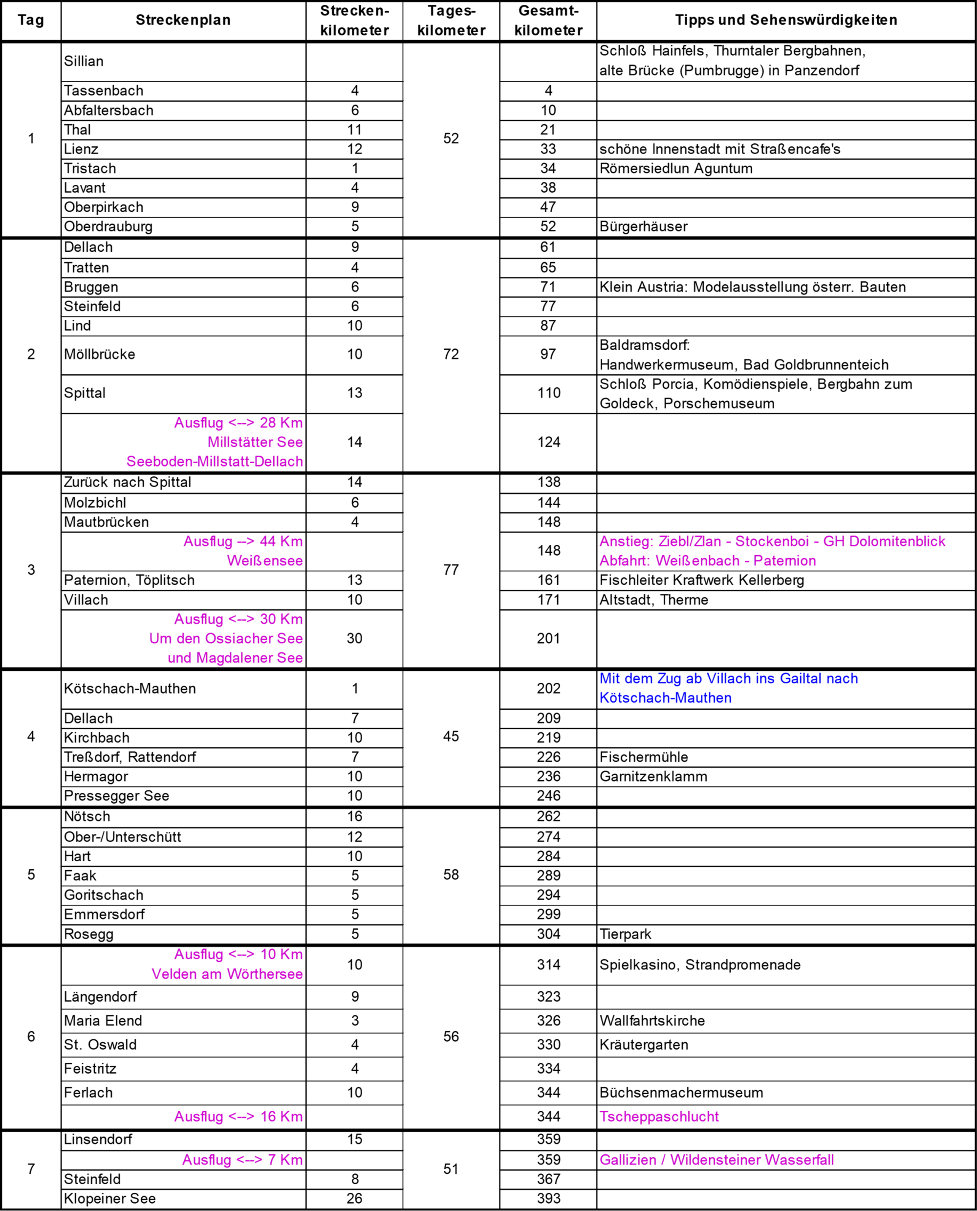 Zuerst sind die Berge der Lienzer Dolomiten, später die warme Badeseen Kärntens unsere Begleiter. Ohne zu übertreiben geht es wirklich fast nur auf der ganzen Strecke bergab. 7 Radeltage mit ca. 60 Km pro Tag sind einzuplanen. Wer’s etwas anstrengender haben will, sollte den Abstecher mit einem zusätzlichen Radeltag an den Weißensee (ca. 500 m Anstieg)
