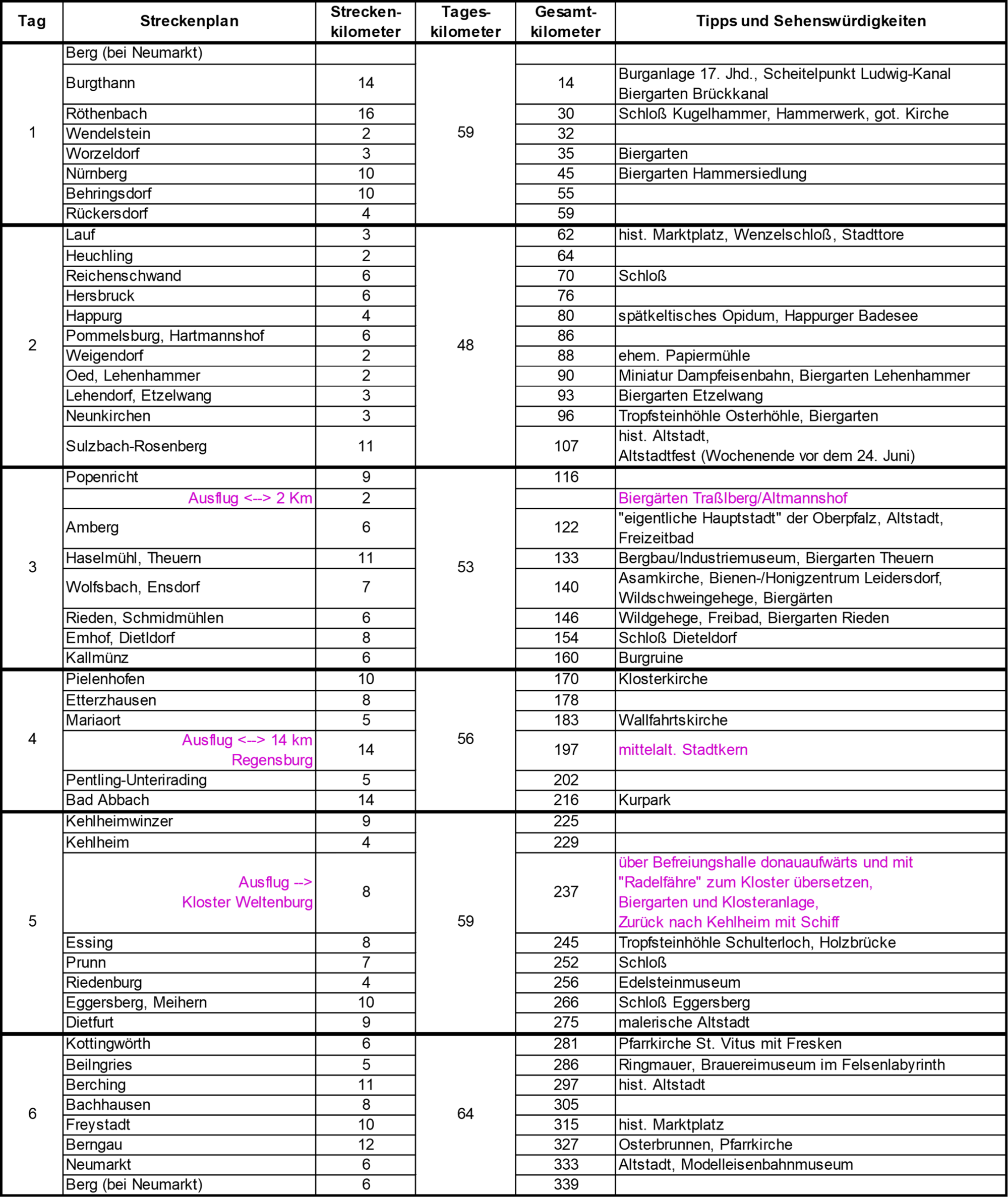 Ein Tagesbesuch in Nürnberg mit z.B. Besichtigung der Burg oder des sehenswerten Spielzeugmuseums ist lohnenswert. In Sulzbach-Rosenberg darf (am Besten als Übernachtungsort auf der Tour) das Altstadtfest am Wochenende vor dem 24.Juni nicht ausgelassen werden. Jede Menge Bier und Nürnberger Würstchen sind ein toller Tagesabschluß. Am Sonntag des gleichen Wochenendes ist in Amberg bereits am frühen morgen auf dem Amberger Stadtfests ein Frühschoppen Pflicht. Abstecher nach Regensburg und in Kehlheim zum Kloster Weltenburg (das Bier ist hier dunkelbraun) gehören ebenfalls mit zum Programm.