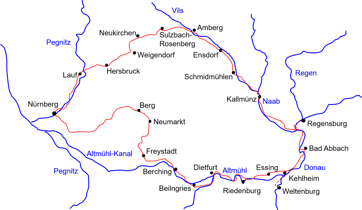 trecke starten. Von Neumarkt bis Nürnberg radelt man direkt am alten König Ludwig Kanal entlang, dann bis Lauf an der Pegnitz. In Amberg ist bis Kallmünz die Vils und ab Kallmünz die Naab unser Begleiter. Donau und Altmühl, bzw. der neue Altmühlkanal sind die größeren Flüsse auf unserer Tour. Wenn die Tour im Uhrzeigersinn gefahren wird, sind vor Sulzbach-Rosenberg und vor Neumarkt kleinere Steigungen zu bewältigen. Aber nichts was wir „Radsportler“ nicht leicht bewältigen können!